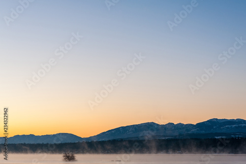 Morning mist at sunrise at the Comox estuary, Comox Valley, British Columbia