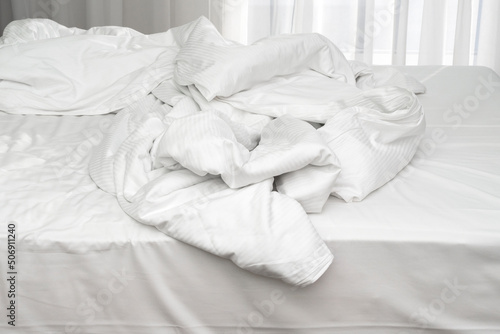 Morning time in hotel, unmade bedding linen, mess with pillows, sheets, blanket