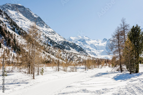 Morteratsch, Morteratschgletscher, Gletscher, Gletscherpfad, Gletscherweg, Piz Bernina, Bellavista, Bernina, Berninapass, Engadin, Alpen, Graubünden, Winter, Winterwanderweg, Langlauf, Schweiz