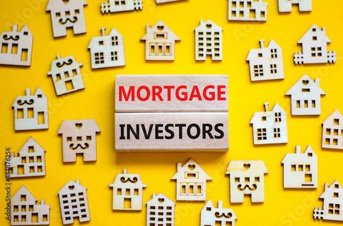 Mortgage investors symbol. Concept words 'Mortgage investors' on wooden blocks near miniature wooden houses. Beautiful yellow background. Business, mortgage investors concept.