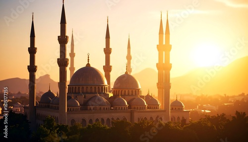 mosque, sunrise, silhouette, gold, light, architecture, islamic, religion, city, landscape, serene, majestic, beautiful, dawn, peaceful, stunning, tranquil, vibrant, dome, minaret, prayer, holy, faith, travel, scenic, amazing, colourful, outdoors