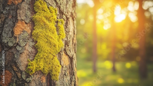 Moss Growing on Tree Bark in a Warm Sunlit Forest Scene