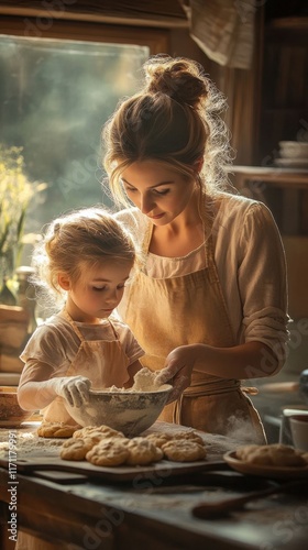 Mother and child baking cookies.
