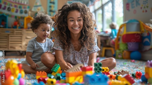 Mother and Child Enjoying a Creative Playtime with Colorful Blocks