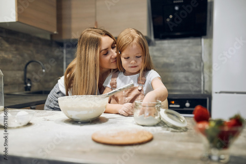 Mother and daughter are preparing pancakes. Family cooking. Preparing breakfast. Knead the dough. Soiled in flour, hug each other