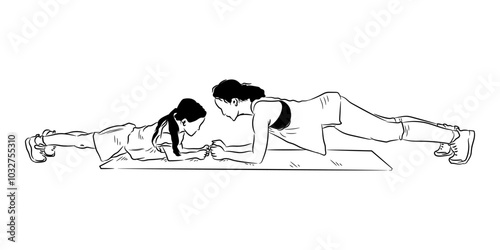Mother and daughter exercising plank pose, hand drawn line drawing vector illustration