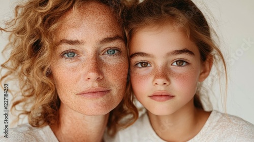 generation, skincare, advertising, mother, daughter, freckle, caucasian, female, children, young, smile, curly, hair, eye, family, love, connection, portrait, skin, natural, beauty, intimate, closeness, bond, human relationships, togetherness, serene, peaceful, gentle, affectionate, posed, happy, expression, lip, cheek, brightness, sunlight, hugs, tenderness, affection, warmth, innocence, purity, simplicity, harmony, admiration, timeless, oneness