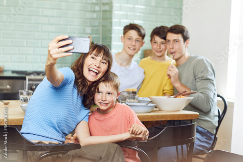 mother, 4, son, taking, smartphone, lunch, happiness, fun, laughing, smiling, family, technology, 5, people, communication, adult, children, boy, group, woman, man, home, son, quality time, using, wireless, self-portrait, togetherness, connection, selfie, sharing, bonding, memory, mobile, phone, community, casual attire, kitchen, confidence, enjoyment, optimistic, carefree, security, bowl, caucasian, teenage, teenage, preschool