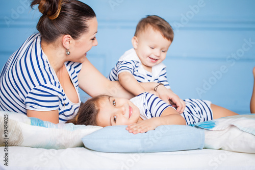 Mother and her happy children lying on a bed