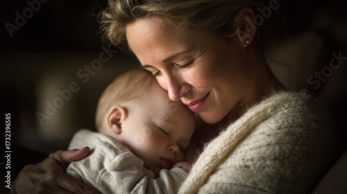 Mother cradles her sleeping baby in a warm embrace during a cozy afternoon indoors with soft lighting