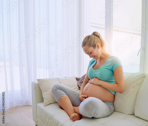 Mother, smile and pregnant woman on sofa in home holding belly for maternity care with happiness. Love, relaxing and maternal female person from Australia touch stomach in living room at apartment.