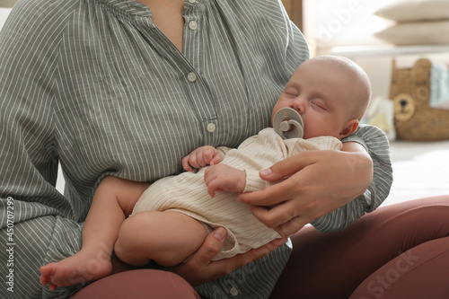 Mother with her cute sleeping baby at home, closeup