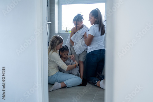 woman, boy, adult, mid, children, preschool, elementary, group, bathroom, bathe, help, towel, hygiene, mother, son, lesbian, togetherness, bond, care, love, eltern, gem, horizontal, indoor, lifestyle, day, britain, family, mixed race, caucasian, 4, people