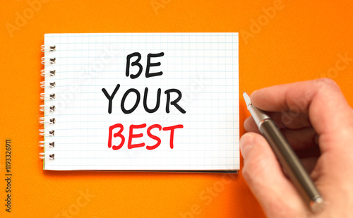 Motivational be your best symbol. Concept words Be your best on beautiful white note. Beautiful orange background. Black pen. Businessman hand. Business motivational be your best concept. Copy space.