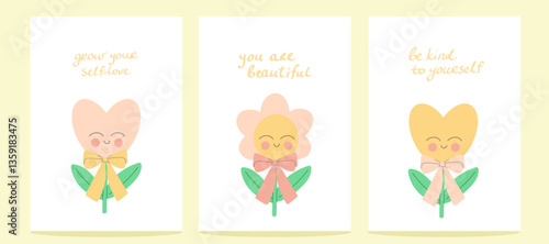 Motivational Flowers Vector Set – Cute Heart and Sun Flower Characters with Self-Love Quotes in Pastel Style