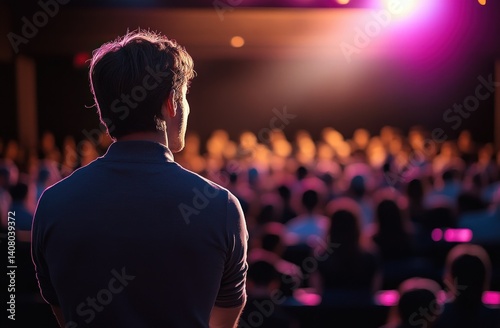Motivational Speaker Addressing Audience in Conference Auditorium with Dramatic Lighting and Blurred Background
