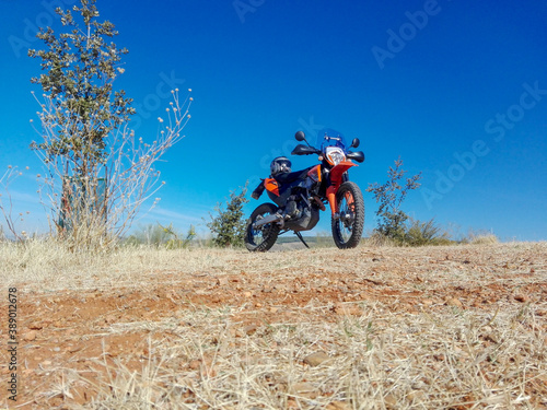 Moto naranja con paisaje de fondo