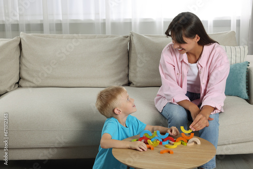 Motor skills development. Happy mother helping her son to play with colorful wooden arcs at coffee table in room. Space for text