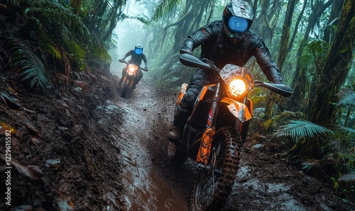 motorcycle, dirt bike, offroad, adventure, jungle, forest, muddy, trail, tropical, rainforest, tree, plant, greenery, rider, helmet, goggles, wet, misty, dark, action, speed, thrill, adrenalin, challenging, difficult, intense, rugged