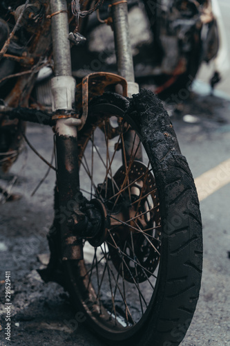 abandoned, accident, automobile, background, bike, black, broken, burn, burning, burnt, car, carbon dioxide, crime, damage, danger, destroy, dirty, engine, fire, flames, hot, iron, machine, metal, motor, motorbike, motorcycle, oil, old, reusing, rust-eaten, smoke, tire, transport, transportation, vehicle, waste, wheel