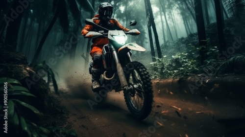 Motorcycle enduro racing motocross in forest downhill. Neural network ai generated art
