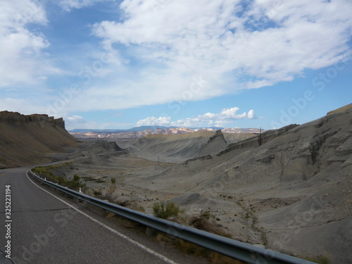 motorcycle, riding, away, from, the, storm, leaving, behind, back, seat, tire, vale, southwest, utah, distant, mountain, winding, road, to, summit, mauve, desert, sand, up, and, a, most, unusual, day, guard rail, cliff, safety, backward, glance, outdoors, nature, highway, horizon, all, ourselves, gratitude, is, attitude