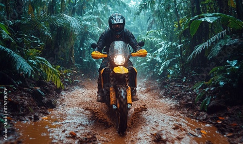 motorcyclist rides through muddy jungle trail in rain. adventure, exploration, and resilience. travel, motorcycle, or outdoor-related content.