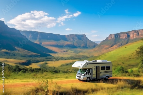 motorhome, parked, field, mountain, background, nature, landscape, travel, adventure, vehicle, camper, camping, sky, blue, green, grass, journey, vacation, road trip, exploration, recreation, lifestyle, tour tourism, holiday, rural, wilderness, freedom, expedition, destination, wanderlust, car, transportation, beauty, scenery, view, horizon, countryside, hill, remote, vale, relaxation, sightseeing, picturesque