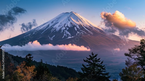 Mount Fuji with a snow-capped peak in dawn light, serene and majestic, natural early morning light, 24-70mm focal length.