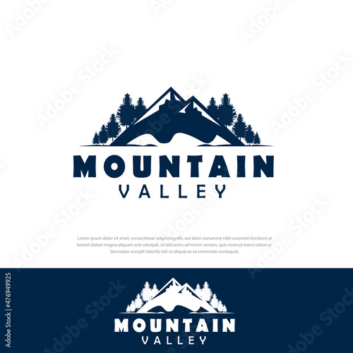 Mountain and pine tree logo nature adventure, campsite and valley