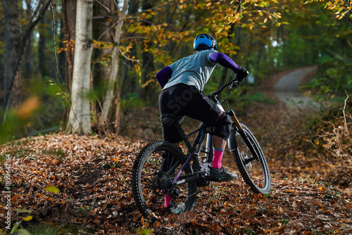 mountain, biker, autumn, forest, trail, leaf, fall, nature, outdoors, adventure, fitness, sport, bike, mountain bike, gear, helmet, protective, equipment, path, wilderness, colourful, scenery, leaf, litter, ground, ride, riding, athlete, motion, dynamic, speed, momentum, trailhead, route, autumn, pink, sock, agility, acceleration, active, cardio, challenge, consistency, dedication, discipline, drive, endurance