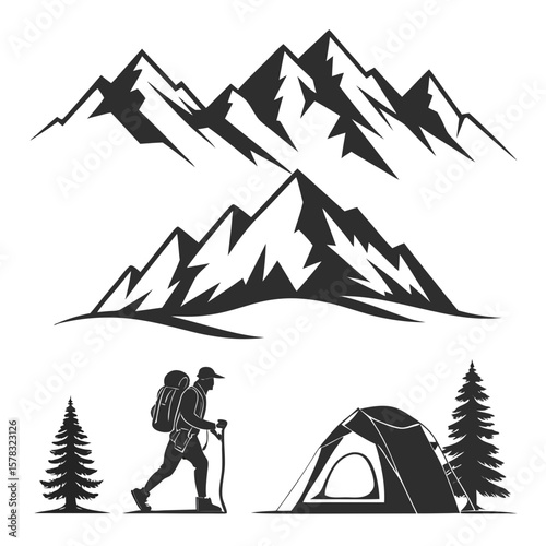 mountain, climber, tent, pine tree, hiking, camping, adventure, silhouette, black-and-white, nature, outdoors, exploration, travel, wilderness, landscape, trekking, backpacker, summit, peak, recreation, journey, forest