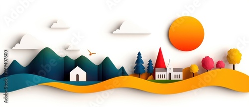 presentation, earth, graphic, organised, shoreline, house, rustic, mountain, web, scenic, tone, illustration, cloud, art, sunset, sky, design, style, destination, water, wall, background, travel, beach, landscape, forest, view