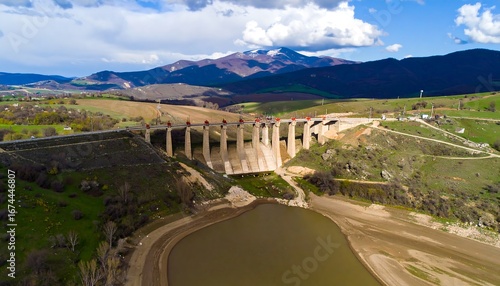 dam, reservoir, mountain, landscape, water, nature, vale, river, green, brown, earth, construction, infrastructure, engineering, aerial, view, travel, tour tourism, photo, cloud, sky, hill, spring, summer, scenic