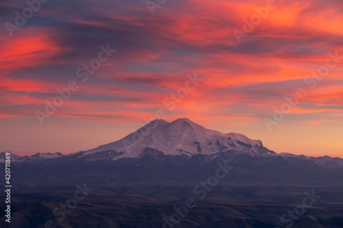 caucasia, cloud, cloud, dawn, desert, dusk, evening, fog, landscape, mountain, mountain chain, nature, outdoors, peak, plateau, red sky, russia, sky, snow, sun, sunset, vale, wasteland