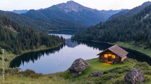 Mountain lake cabin at dusk. Peaceful alpine scene. Possible use Stock photo for travel, nature, or relaxation