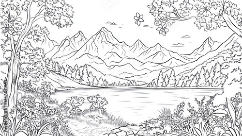 lake, mountain, serene, landscape, nature, colouring, page, outdoors, scenic, view, water, sky, tree, hill, forest, calm, peaceful, tranquil, relaxing, beautiful, majestic, summer, spring, art, illustration, design, background, graphic, image, picture, drawing, vignetting, wildlife, travel, adventure, scenery, panorama, vista, environment, wilderness, rural