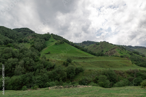 Mountain landscape with blue sky. Panoramic view of green hills.
