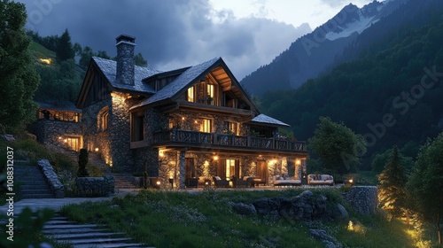 Mountain lodge with wood and stone structure, scenic mountain views, cozy lights