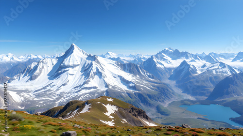 mountain peak covered with snow Alpine meadows, mountain ranges, crystal clear lakes wilderness area The beauty of nature, mountain climbers