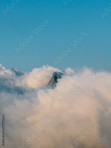 mountain, peak, cloud, blue, sky, nature, landscape, elevation, summit, fog, atmospheric, high, aerial, mist, serene, peaceful, panoramic, scenic, outdoors, environment, majestic, rock, skyward, calmness, vista, clear, white, natural, beautiful, horizon, picturesque, view, geography, terrain