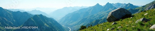 Mountain range with isolated boulder and lush green vegetation, solitary, green, rugged