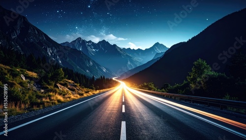 mountain, road, night, star, sky, light, sunrise, sunset, landscape, travel, journey, nature, scenic, asphalt, highway, forest, tree, vale, mountain, misty, cloud, dark, bright, horizon, perspective, long, exposure, vehicle, path, adventure, exhilarating, stunning, impressive, huge, serenity, calm, inspiring, beautiful, dramatic, majestic, clear, night time, panorama