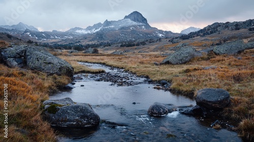 mountain, stream, vale, autumn, landscape, nature, scenic, outdoors, river, travel, peak, cloud, rocky, grey, misty, hill, calm, waterfall, flowing, rock, stone, clear, fresh, green, brown, forest, panorama, tour tourism, exploration, adventure, trip, scenery, hiking, serenity, tranquil, calmness, majestic, picturesque, mountain, mountainous, relaxing