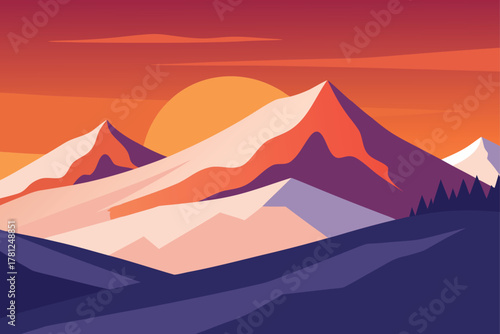 mountain, sunset, vector, graphic, peak, silhouette, sky, nature, landscape, view, geometric, design, adventure, flat, illustration, travel, background, tree, forest, hill, terrain, scenery, climbing, hiking, calm, serene, orange, purple, white, sun, abstract, modern, vibrant
