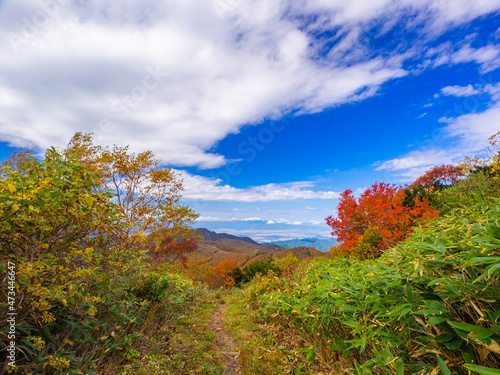 autumn, leaf, fall, tree, mountain, peak, foliage, path, way, track, trail, colourful, colours, red, orange, yellow, green, grass, bamboo, bush, forest, wood, sunny, sky, cloud, zao, japan, walk, hike, trek, plant, nature, travel, tour tourism, holiday, october, autumn, season, ski resort