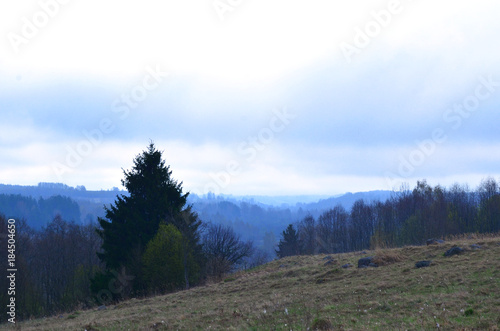 mountainous hilly terrain in the blue morning fog