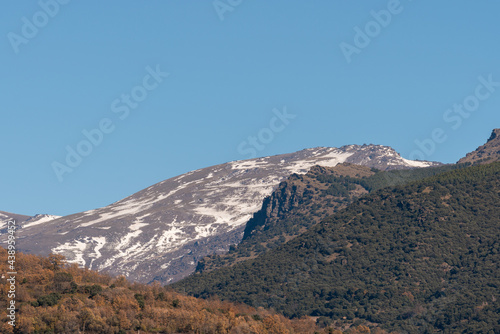 andalusia, bush, clear, environment, europa, granada, landscape, mountain, mountainous, nature, ravine, rock, sierra nevada, sky, snow, spain, stone, town, tree, vegetation