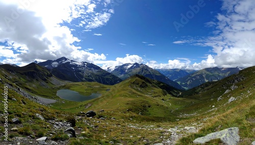 mountain, landscape, panorama, vale, alpine, peak, sky, cloud, blue, green, grass, nature, scenic, vista, summer, highland, meadow, lake, water, sunlight, summit, rocky, terrain, view, wilderness, stunning, huge, tranquil, elevation, high, alps, scenery, clear, fresh, fresh air, gorgeous, amazing, beautiful, expansive, high altitude, calmness, breathtaking