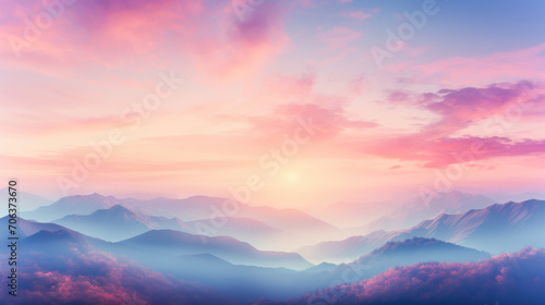Mountains landscape background. Serene mountain vista bathed in soft dawn or dusk light, with rising mist and a sky painted in pink and lavender, evoking the calm of nature's beauty